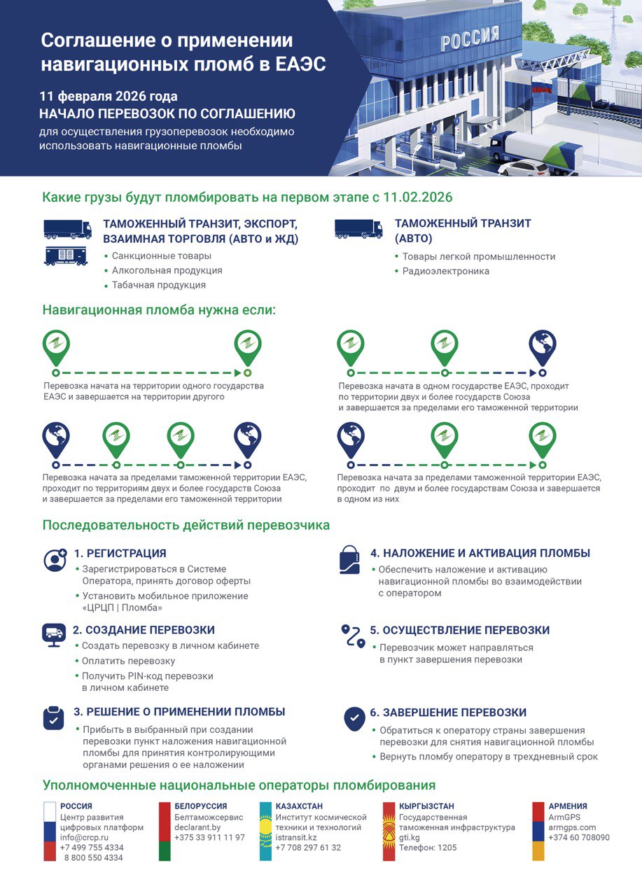 Версия для печатиВ соответствии с Решением Коллегии Евразийской экономической комиссии от 23 сентября 2025 года № 84 с 11 февраля 2026 года на территории государств-членов ЕАЭС начинается осуществление перевозок с применением навигационных пломб в соответствии с Соглашением о применении в Евразийском экономическом союзе навигационных пломб для отслеживания перевозок от 19 апреля 2022 года (далее – Соглашение).