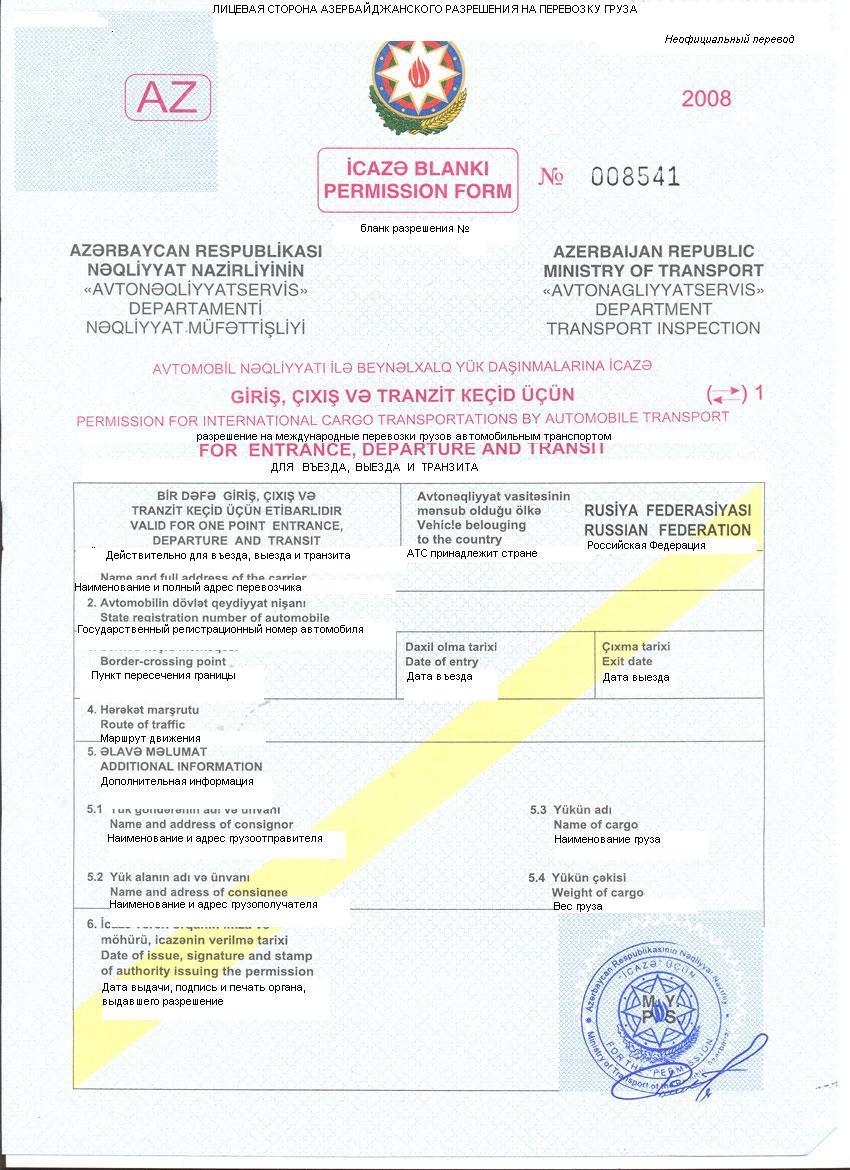 Бланки разрешений на перевозки грузов и пассажиров в международном сообщении изготовляются государствами в соответствии с рекомендацией № 119/1977 Комитета по внутреннему транспорту ЕЭК ООН и должны содержать ряд необходимых данных. В соответствии с договоренностью Минтранса РФ с компетентными органами других стран иностранные бланки разрешений, как правило, имеют перевод на русский язык.